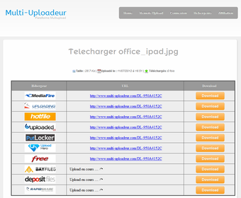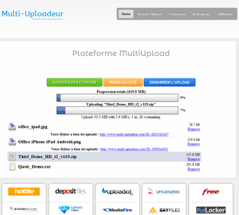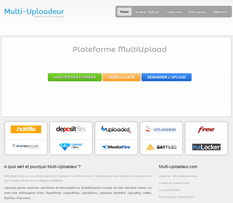 Multi-Uploadeur est une plateforme MultiUpload simple d'utilisation et efficace. Une parfaite alternative à multiupload pour partager des fichiers volumineux.