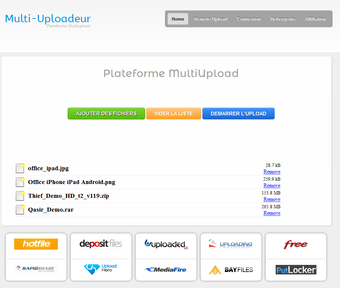 Rendez-vous sur Multi-Uploadeur et téléversez vos fichiers sur le site en cliquant sur le bouton ajouter des fichiers. Une fois vos fichiers chargés sur le site, ce dernier se chargera de les copier automatiquement auprès de 10 services de stockage en ligne différents (Hotfile, Deposit Files, Uploaded, Uploading, Free, Rapidshare, Upload Hero, MediaFire, BayFiles et PutlLocker). Multi-Uploadeur générera ensuite un lien unique qu'il vous suffira de communiquer aux contacts avec qui vous souhaitez partager vos fichiers.