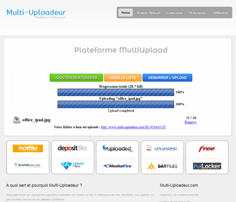 Multi-Uploadeur est un service de stockage en ligne qui vous permet d'envoyer de gros fichiers à vos contacts en toute simplicité. Mieux, le site vous donne la possibilité d'uploader vos fichiers de façon anonyme auprès de 10 hébergeurs automatiquement pour plus de sureté.